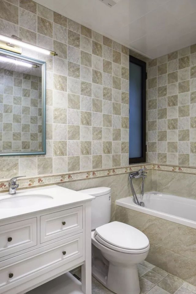 卫生间内选择了做一个浴缸来代替淋浴区,这样屋主有需求的时候,也可以享受一下惬意的泡澡时光。深浅色的瓷砖让卫生间看起来更有层次感。