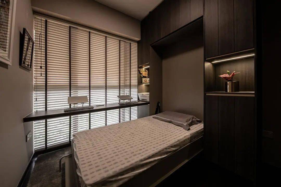 面积很小的书房也同样适用这种设计,床头柜延伸出简单的桌面,在这里学习、睡觉两不误。