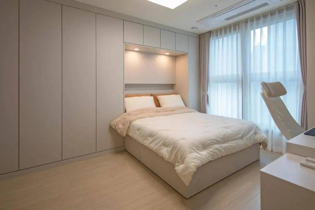 整面衣柜留空设计置物区,半护墙+置物区的一体化设计把床头柜省了,让空间的整体感更好,让卧室更显得干净、利落。