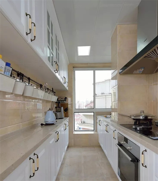 有些厨房规格偏长,长方形设计的厨房可以设计成“L”型,这样设计空间利用率更高,方便加装橱柜,增加储物空间。也方便动线设计,让整个厨房操作流程更顺手。