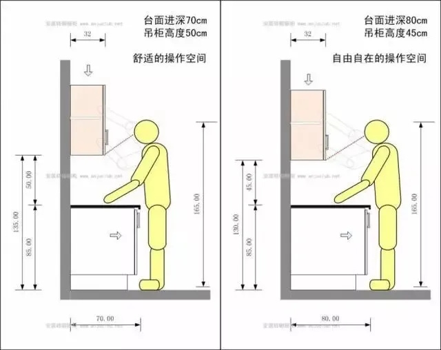 2. 台面高度设计:根据实际操作人高度,普遍为80-85cm,台面材料要选防水、防火,防腐蚀,易清洁的人造石英石材料。